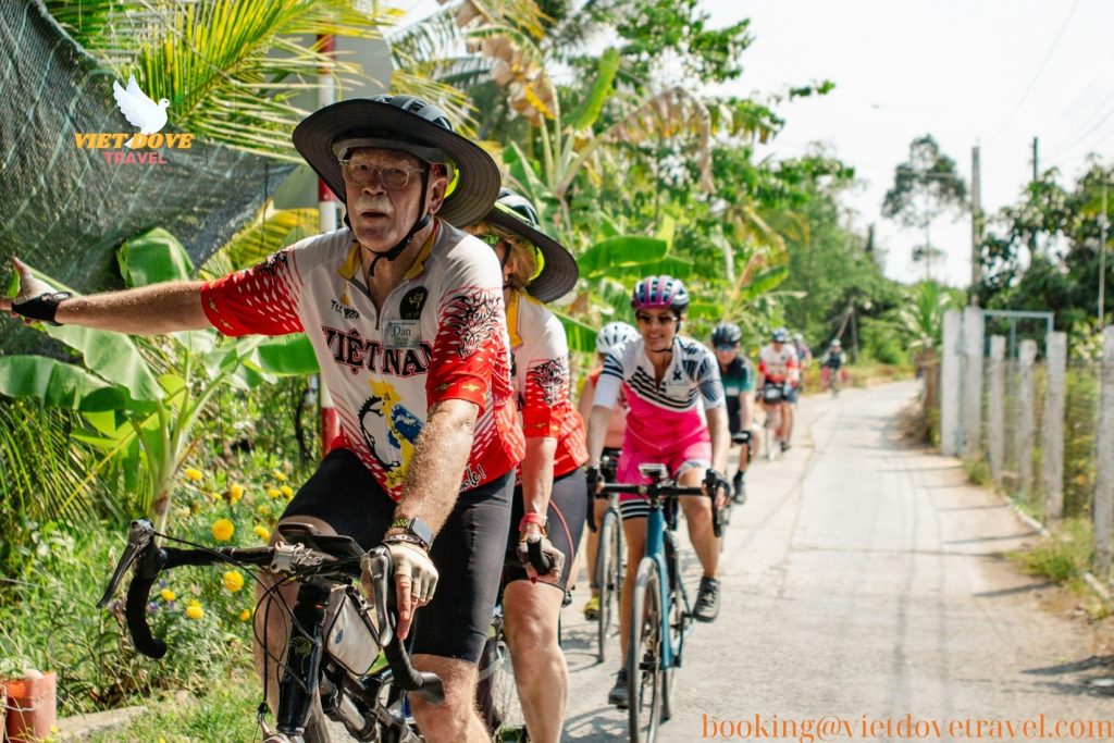 Tourists biking through rice fields, village road